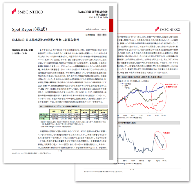 | Spot Report(株式) | 随時 | Spot Report(株式)は、日本株式市場動向に関する注目すべきトピックをいち早く提供する、機動性を重視したレポートです。投資環境の変化が激しい現在、旬の情報を提供いたします。 |