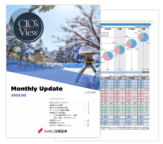 | CIO’s View Monthly Update | 月次 | 季刊誌「CIO’s View」からのマクロ・市場見通しをアップデートするとともに、円ベースのモデル・ポートフォリオ、相対評価の修正点についてもお知らせします。 |