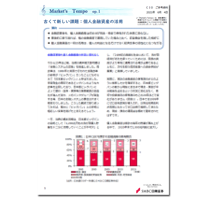 | Market’s Tempo | 随時 | 【CIOレポート:スタンダード】本シリーズは、資産運用に関連するタイムリーな情報や中長期の投資戦略等について分かりやすく整理したレポートです。 |