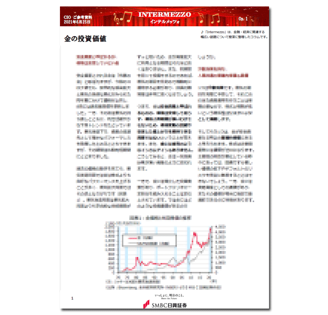 | Intermezzo(インテルメッツオ) | 随時 | 【CIOレポート:コメンタリー】本シリーズは、金融・経済に関連する幅広い話題について簡潔に整理したコラムです。 |