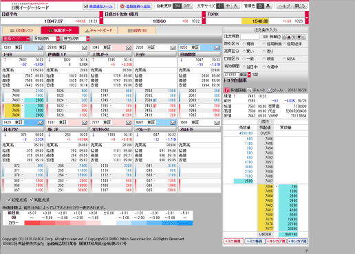 「株価ボード」は、お客さまが気になる銘柄の4本値、複数気配、出来高、チャートなどの株価情報が一覧で確認できる自動更新ツールです。最大で100銘柄まで登録可能で、リアルタイムで動く株価を見ながらスピーディーに注文を行えます。