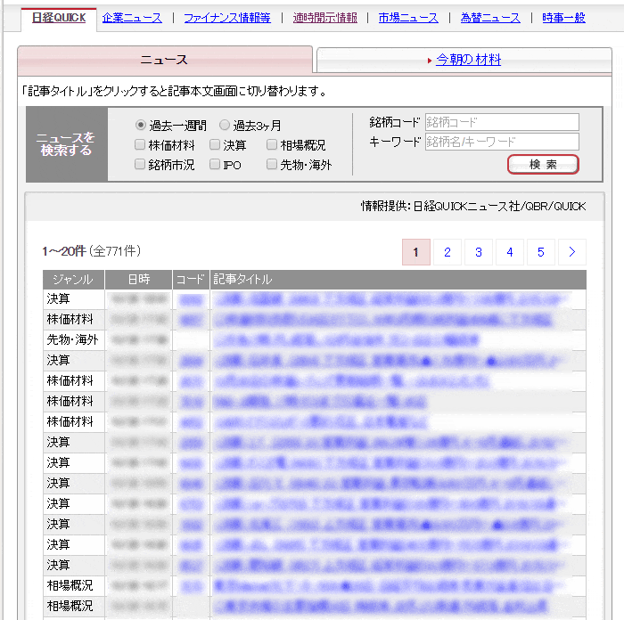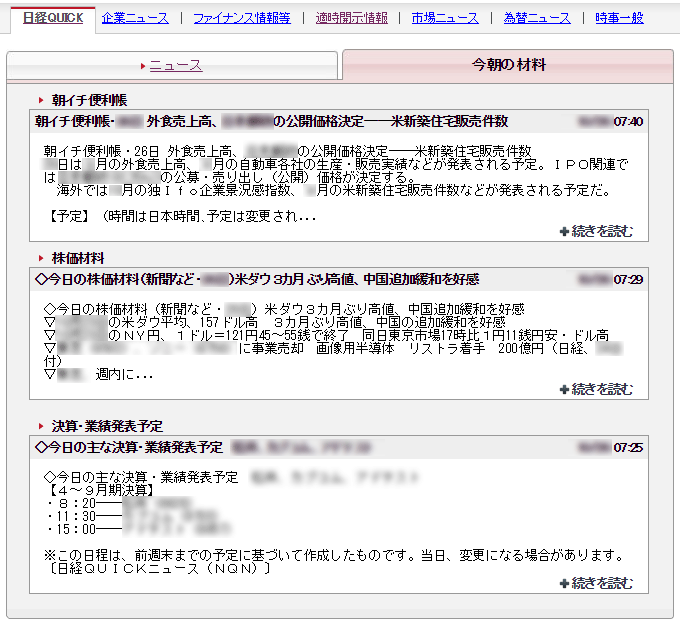 「今日の株価材料」や「注目イベント」などの株価材料や「今日の株式」「日経平均・週間ラウンドUP」などの相場概況、IPO・決算・先物及び海外の概況に関する情報までご提供いたします。また企業ニュース、ファイナンス情報、市場ニュース、為替ニュース、時事一般なども見ることができます。情報提供:NQN、QUICK、QBR、時事通信社