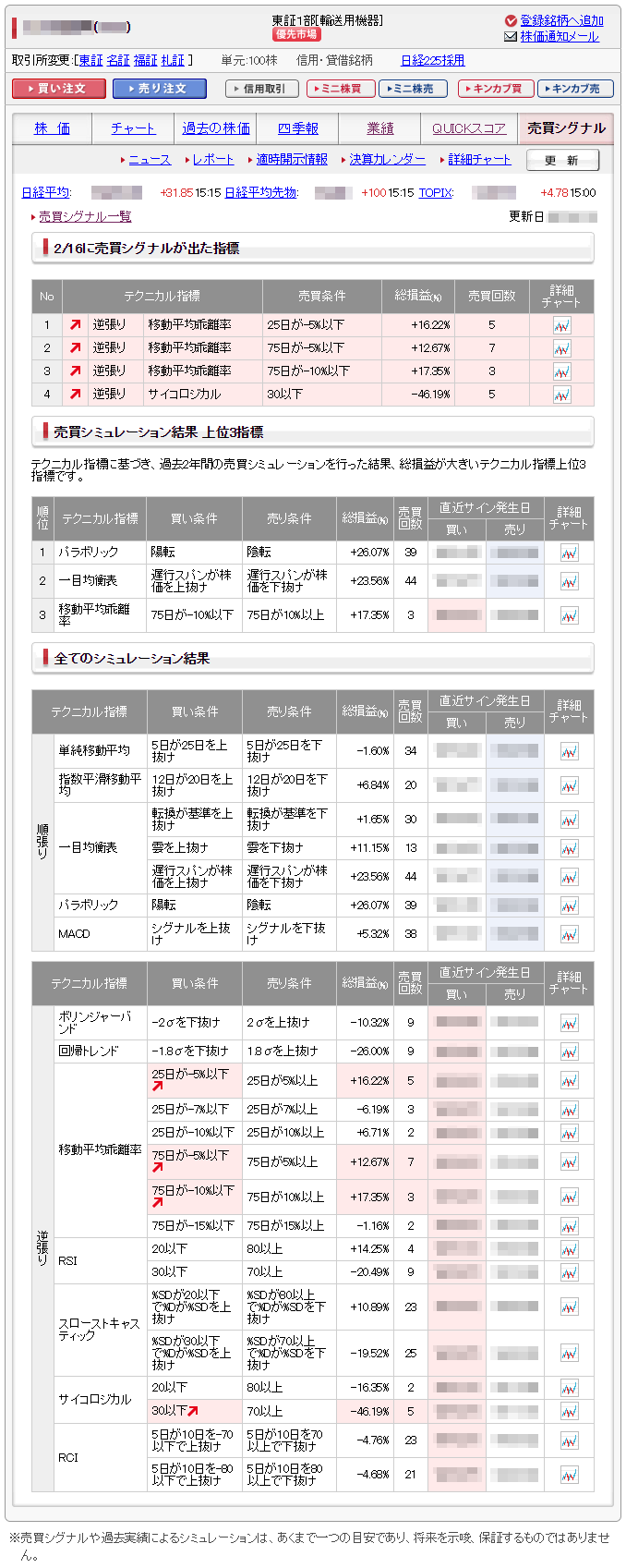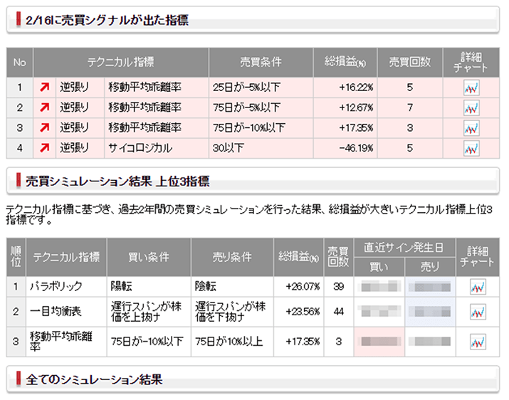 最大過去2年間のテクニカル指標(12指標、23パターン)のデータに基づいて売買シミュレーションした結果から総損益の大きいテクニカル指標上位3指標や直近サイン発生日などを表示します