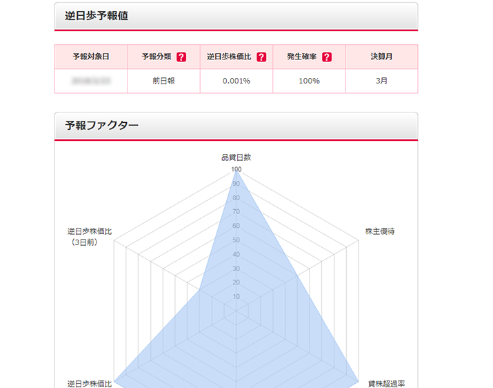 逆日歩予報は、個別銘柄に関する逆日歩の発生確率と大きさを事前に予測します。膨大な過去の市場データや逆日歩の発生実績から算出した予測情報を、グラフ等を交えてわかりやすく表示します。