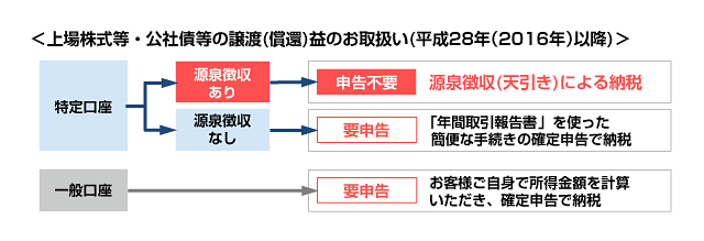 平成28年(2016年)以降、公社債等の譲渡(償還)益)は、原則、確定申告が必要となりますが、「源泉徴収あり」特定口座を開設いただくと、確定申告が不要となります。