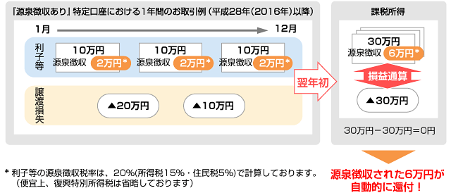 - 『源泉徴収あり』特定口座においては、上場株式等の配当等と譲渡損失との自動的な損益通算が可能です。2016年以降は、公社債等の利子等も自動的な損益通算の対象となります。