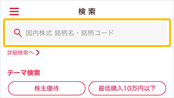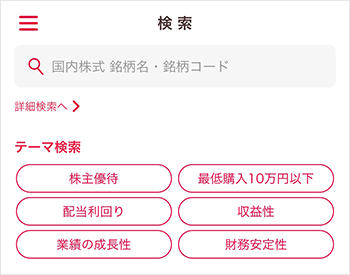 国内株式の銘柄を見つけるための機能にアクセスできます。検索枠をタップすると、銘柄検索画面に遷移します。詳細検索やテーマ検索にも簡単にアクセスが可能です。
