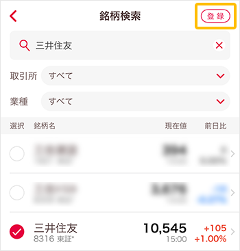 ②検索結果の「選択」欄をタップし、「登録」をタップします。(複数の銘柄を同時に登録することもできます。)