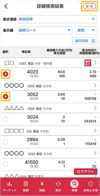 ③検索結果が表示されます。銘柄を登録する場合は、登録する銘柄の「選択」欄をタップしてから「登録」ボタンをタップします。