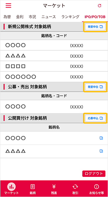 ※ログイン後は「需要申告」「応募申込」をタップすることでパソコンサイトの新規公開株式 取扱銘柄一覧、 公募・売出 取扱銘柄一覧、公開買付け取扱銘柄一覧へアクセスすることが可能です。